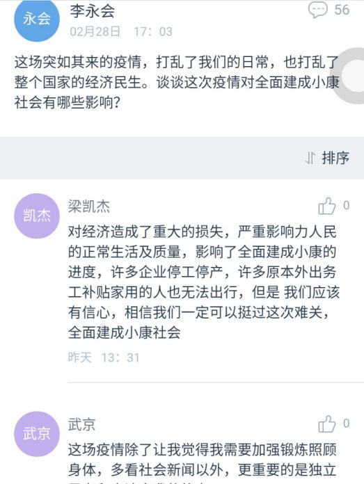 毛泽东思想和中国特色社会主义理论体系概论课结合“马克思主义中国化”专题,从伟人的家国情怀进行教学导入,引导同学们结合这场“战疫”,从“献给最美逆行者”、“疫情反思”等不同角度进行讨论、撰写体会。