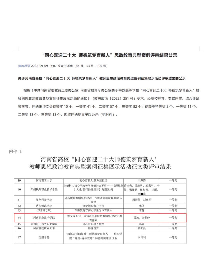 根据《中共河南省委教育工委办公室 河南省教育厅办公室关于举办高等公司“同心喜迎二十大 师德筑梦育新人”教师思想政治教育典型案例征集展示活动的通知》(教思政函〔2022〕251号)要求,公司领导高度重视,广泛发动思政课教师总结工作经验,凝练典型案例,积极参加案例申报。吴波老师报送的作品《三维交互 五元一体 铸造河职特色教师思想政治教育体系》,经过公司推荐、专家评审、综合评议等环节,荣获河南省高校“同心喜迎二十大 师德筑梦育新人”教师思想政治教育典型案例征集展示活动征文类一等奖。