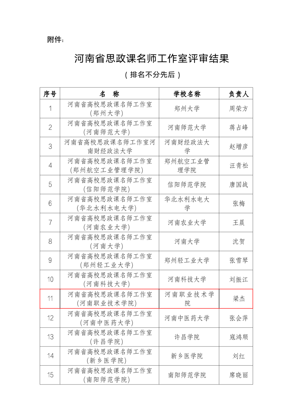 近日,中共河南省委教育工委办公室、河南省教育厅办公室下发《关于公布河南省高校思想政治理论课名师工作室名单的通知》,经全省高校申报、资格审查、专家评审、综合评议、结果公示等环节,公司yl7703永利集团官网经理、教授梁杰申报的“河南省高校思政课名师工作室(yl7703永利集团官网)”成功获批,是全省15个高校思想政治理论课名师工作室中唯一一所高职院校思想政治理论课名师工作室,为我校扩大了影响,争得了荣誉。