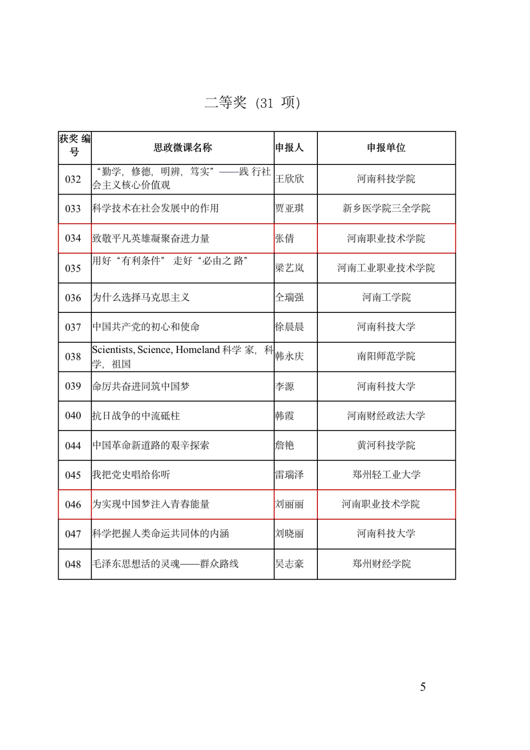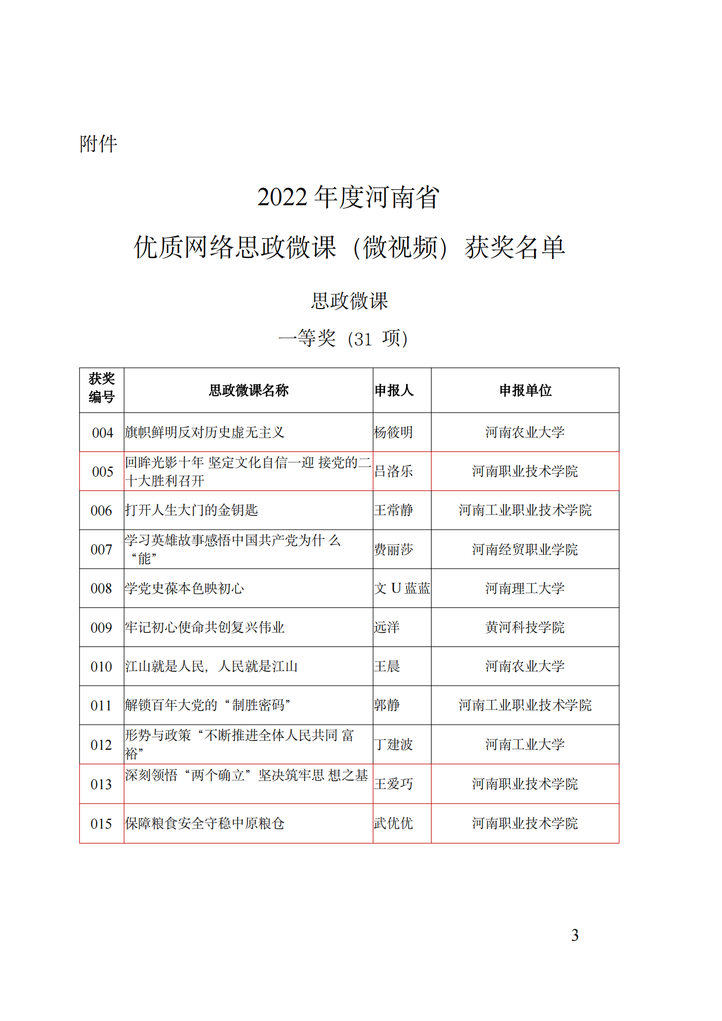 在优质网络思政微课赛项中,王爱巧、武优优、吕洛乐申报的《深刻领悟“两个确立”坚决筑牢思想之基》《保障粮食安全 守稳中原粮仓》和《回眸光影十年 坚定文化自信 ——迎接党的二十大胜利召开》三个思政微课作品分别获得一等奖;刘丽丽、张倩申报的《为实现中国梦注入青春能量》和《致敬平凡英雄 凝聚奋进力量》两个思政微课作品分别获得二等奖。李柯冉同学申报的老员工主题微视频作品《“豫”见黄河文化 坚定文化自信》获得一等奖。