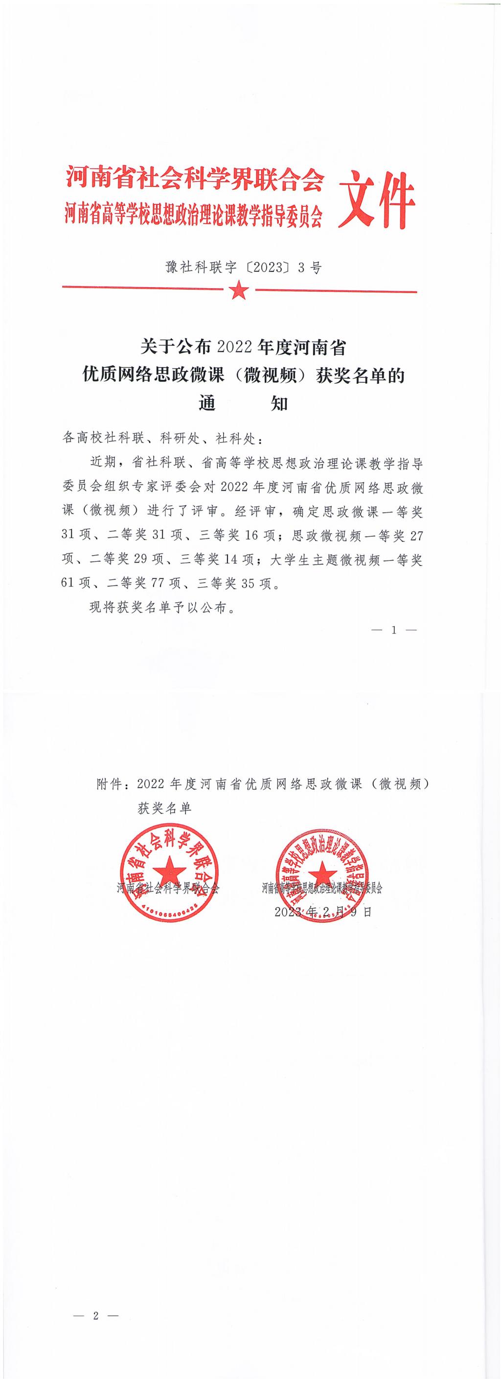 近日,省社科联、省高等公司思想政治理论课教学指导委员会组织专家评委会对2022年度河南省优质网络思政微课(微视频)比赛进行了评审,公司申报的6项作品全部获奖。