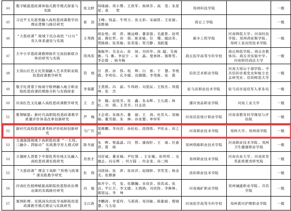 近日,河南省教育厅下发了《关于2024年河南省高等公司产品改革研究与实践项目(思政课类)立项结果的公示》,公司梁杰教授主持的《高职院校“大思政课”实践育人系统性研究》、马广兴副教授主持的《新时代高校思政课考核评价机制创新研究》、房静副教授主持的《劳动教育融入高职院校思政课教学研究》获得立项。