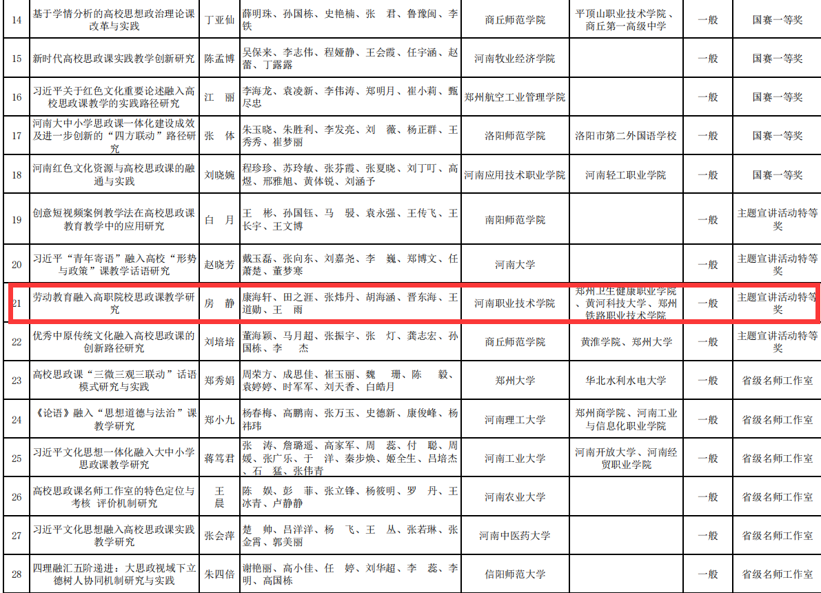 河南省高等公司产品改革研究与实践项目(思政课类)是在公司推荐的基础上,经河南省委教育工委、河南省教育厅组织进行资格审查、专家评定、集中评议,共评选出100项,其中重点项目10项,一般项目90项。公司在此次评审中立项3项,在高职院校中为立项数量最多,亦是公司此类项目申报中立项最多的一次。