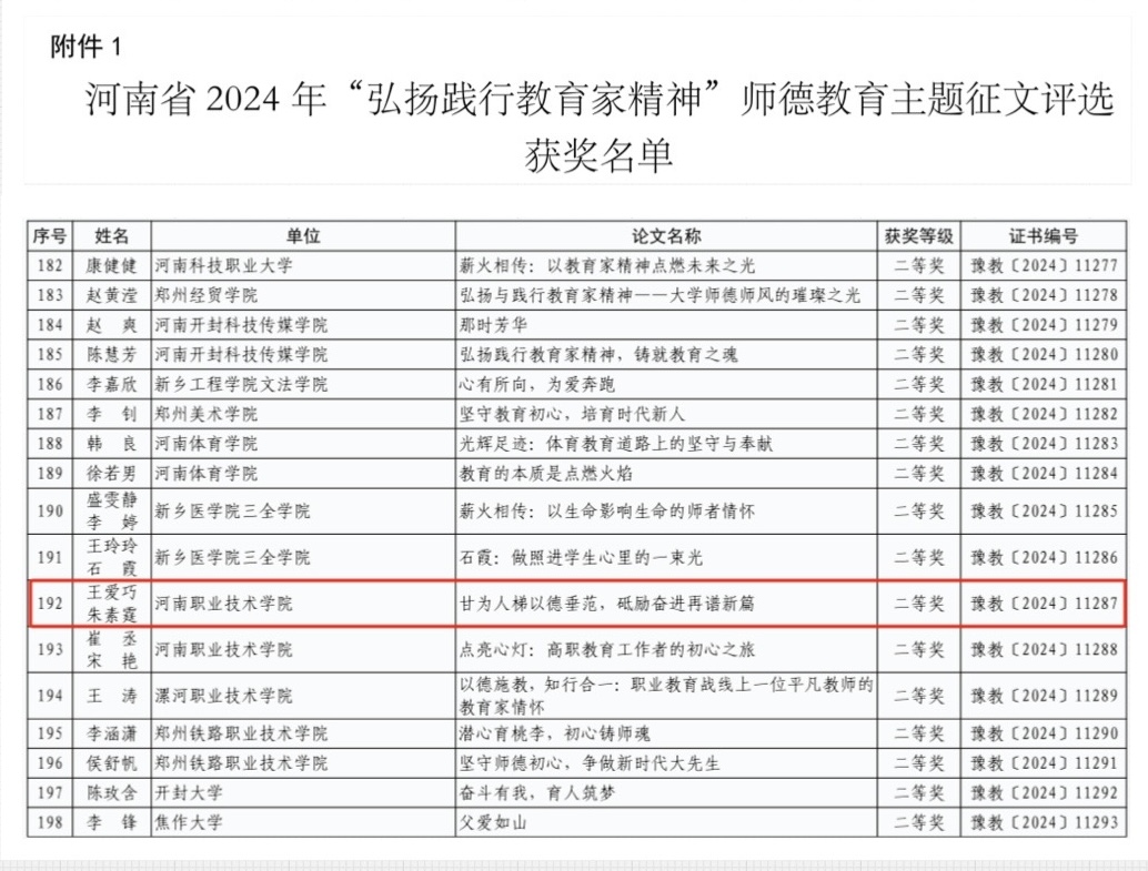 近日,河南省教育厅公布了关于2024年“弘扬践行教育家精神”师德主题教育征文比赛评选结果的通知,经个人报送、专家评审、公司推荐、省级评审等环节,yl7703永利集团官网教师王爱巧、朱素霆报送的文章《甘为人梯以德垂范,砥砺奋进再谱新篇》喜获二等奖。公司在此次征文活动中共获得二等奖两项,这是其中之一。