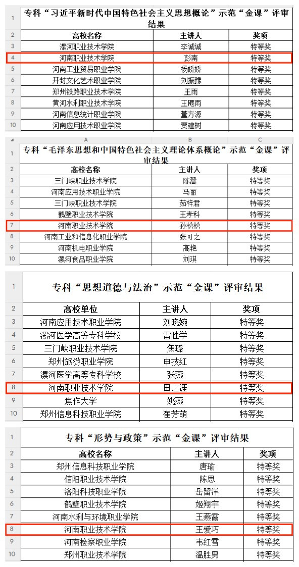 近日,中共河南省委教育工委办公室、河南省教育厅办公室下发了《关于高校思政课优秀课程资源评审结果的公示》,公司教师申报的2门课程全部被评为示范课程,申报的4门示范“金课”全部被评为特等奖,创历史最佳成绩。