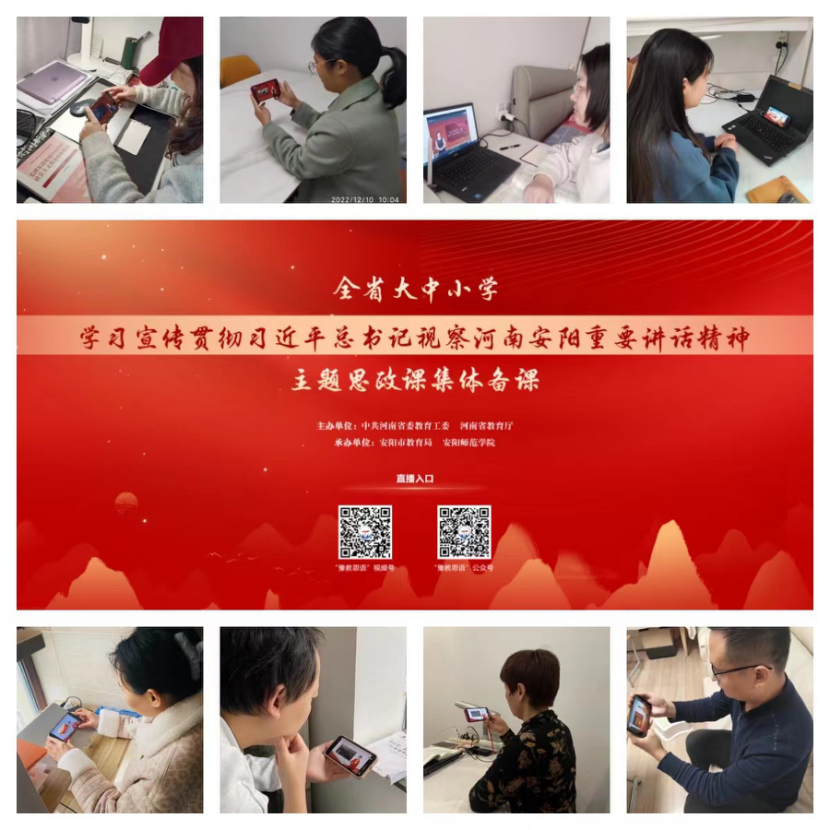 为学习宣传贯彻党的二十大精神和习近平总书记视察河南安 阳重要讲话精神,贯彻落实《关于推进大中小学思政课一体化建设的实施意见》(教思政〔2021〕425 号),按照省委教育工委、省教育厅安排部署,12月10日上午9点,公司组织全体教师通过豫教思语视频号收看了由省委教育工委、省教育厅主办,安阳市教育局和安阳师范公司承办的学习宣传贯彻习近平总书记视察河南安阳重要讲话精神主题思政课集体备课活动。