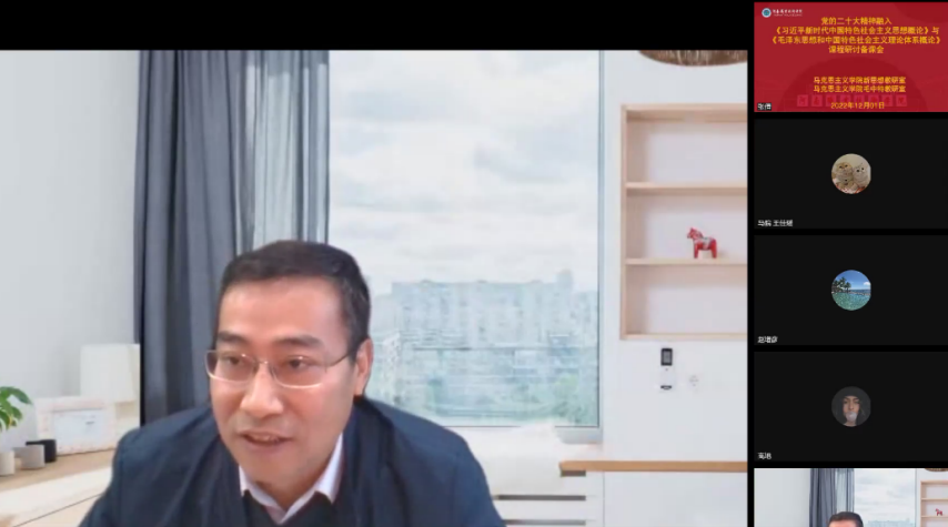 为深入学习贯彻党的二十大精神,将党的二十大理论创新成果有机融入思政课教学,充分发挥好思政课关键课程作用,12月1日下午,yl7703永利集团官网开展主题为“党的二十大精神融入习近平新时代中国特色社会主义思想概论、毛泽东思想和中国特色社会主义理论体系概论”课程研讨备课会,会议邀请了“毛泽东思想和中国特色社会主义理论体系概论”分教学指导委员会副主任委员、河南财经政法大学yl7703永利集团官网经理赵增彦教授、“习近平新时代中国特色社会主义思想概论”分教学指导委员会委员、新乡医公司yl7703永利集团官网经理戎华刚教授进行线上指导交流,yl7703永利集团官网经理梁杰、党总支书记马金伟、副经理胡海涵、副经理王爱巧和习近平新时代中国特色社会主义思想概论教研室、毛泽东思想和中国特色社会主义理论体系概论教研室全体专兼职教师参加了此次会议。