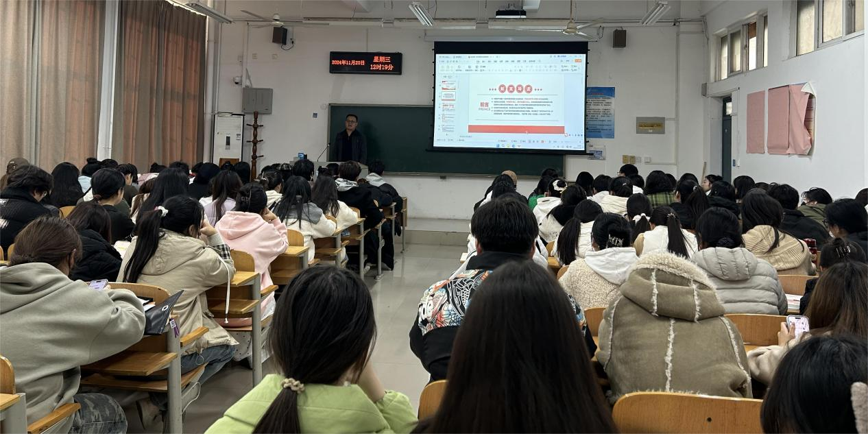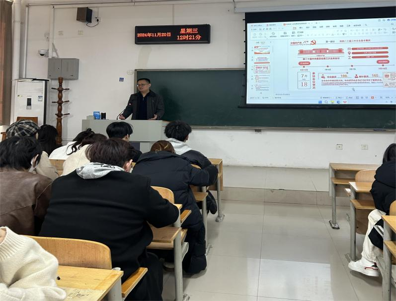 11月20日中午,公司“笃行”宣讲团成员、毛中特教研室教师孙松松在2106教室以“擘画进一步全面深化改革的宏伟蓝图”为题,面向音乐公司100多名同学进行了党的二十届三中全会精神宣讲。