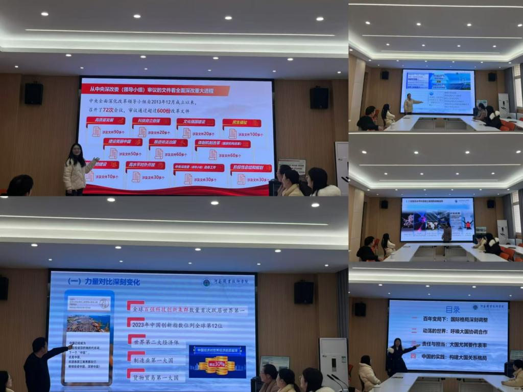 本学期教师们按照学期初安排就《改革的实践续篇 现代化的时代新篇》《加快发展新质生产力》《推动构建新时代的大国关系格局》三个专题面向全校在校生开展教学。在集体备课环节,教师们针对本学期教学专题进行了总结性说课展示并互评。教师们借此机会梳理教学优缺点,为下学期备课教学工作提供了思路和方向。